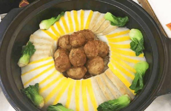 黃陂山河也是一道營養豐富的菜肴,是用魚丸,肉丸,肉糕,三種食材組合而成,下鍋蒸制有著濃濃的肉香味和魚香味。