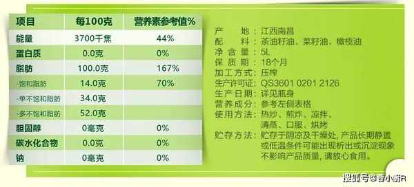 挑選食用油的時候我們還是要認真的看一下標簽和配料表。尤其是配料表那一欄,越簡單越好。如純大豆油、菜籽油、花生油等,配料表裡面一般隻會寫上對應的一種原材料,這樣的才是最純正的食用油。