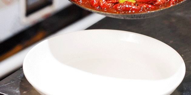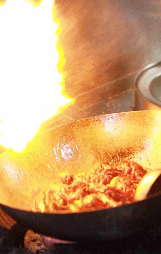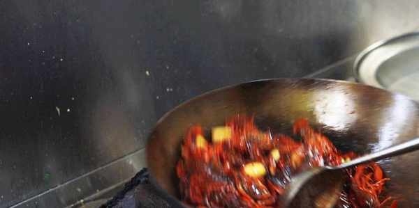 油燒熱,趁小龍蝦們不註意,唰地一下,把它們放進油鍋裡,再放入辣椒,花椒、蔥、薑、蒜等配料,大火用力翻炒。