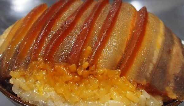 下一步是制作糯米飯。首先將糯米清洗幹凈,然後放入蒸鍋中,將糯米蒸熟,從鍋中取出,放入適量的豬油,然後加入紅糖拌勻,加入紅糖就可以做出糯米瞭看起來更好,味道更甜。然後將拌勻的糯米和豬肉一起放入碗中,放入蒸鍋蒸2小時左右。對,需要蒸的時間長,這樣五花肉蒸的比較軟,吃完沒有油膩的感覺,這點很重要。