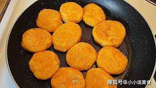 3、平底鍋預熱,鍋底刷上一層油,將準備好的紅薯餅放入鍋中,用小火慢煎。