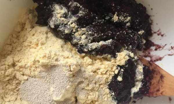 3、黑米加入面粉、玉米粉和酵母,攪拌均勻,揉成面團。
