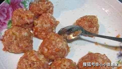 第五步,攪拌均勻後,把勺子拿到一邊,另一隻手抓住肉餡,用虎口把肉餡捏圓,然後用勺子挖空放在一邊,一切處理。按照這個程序把肉餡做成丸子。