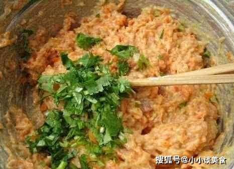 第四步,拌好肉餡後,再把胡蘿卜和切碎的胡蘿卜放入肉餡中,攪拌均勻,再加入香菜粉繼續攪拌。