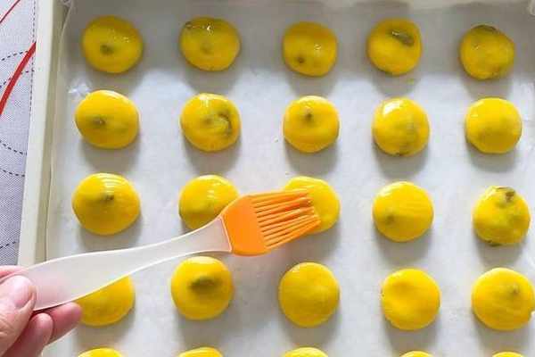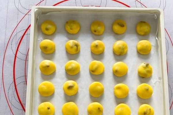 將面團分成10克一個,每個面團揉圓後輕輕壓扁,放入烤盤