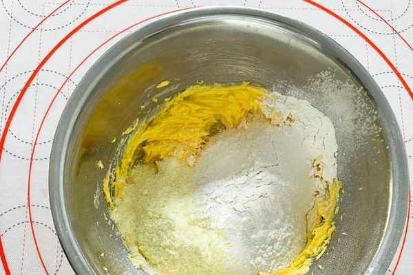 將低筋面粉和奶粉過篩,加入打好的黃油中