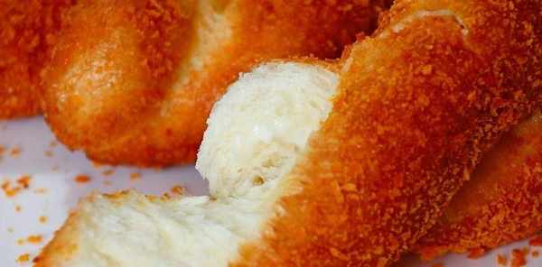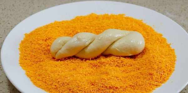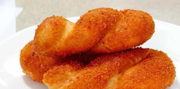 將麻花先沾上一層清水,再放入面包糠中,裹上面包糠。