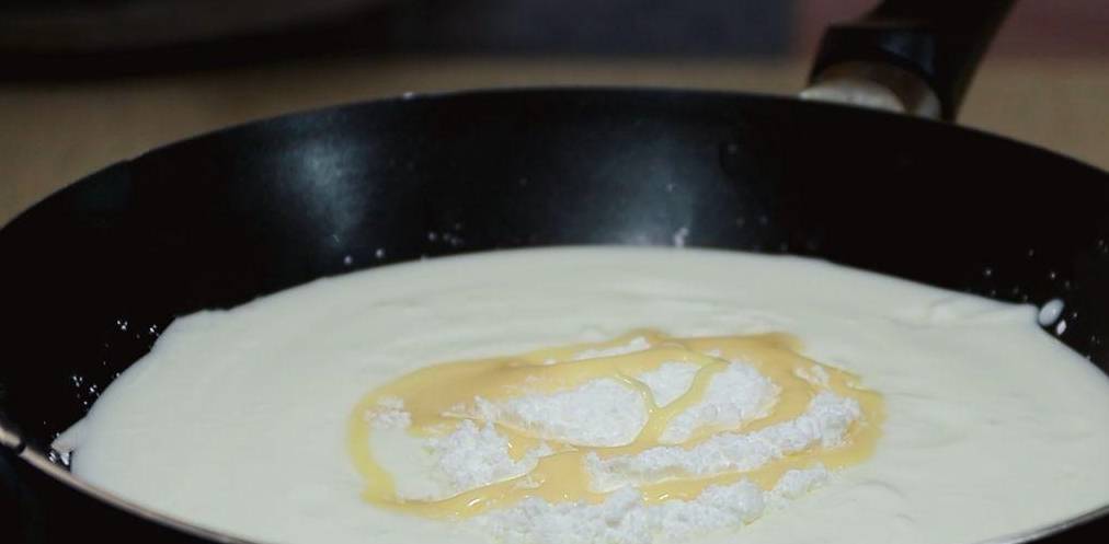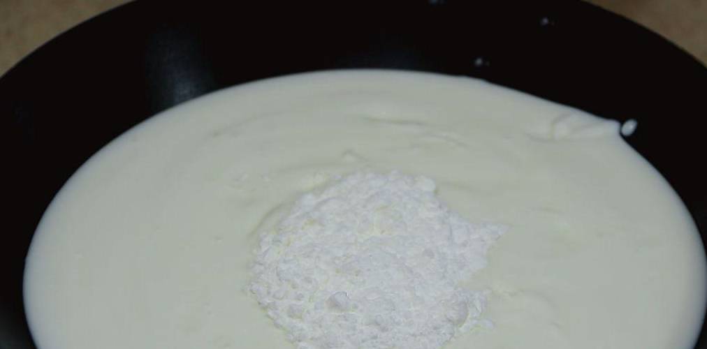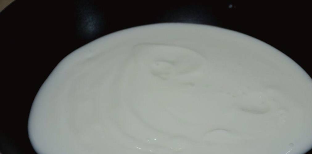 先準備酸奶餡兒,首先把400g酸奶倒入到鍋內,加20g煉乳和20g玉米淀粉,攪拌均勻。