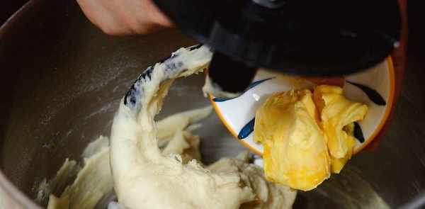 往面團中加入35g黃油,繼續攪拌,攪打至面團能拉出手套膜即可。