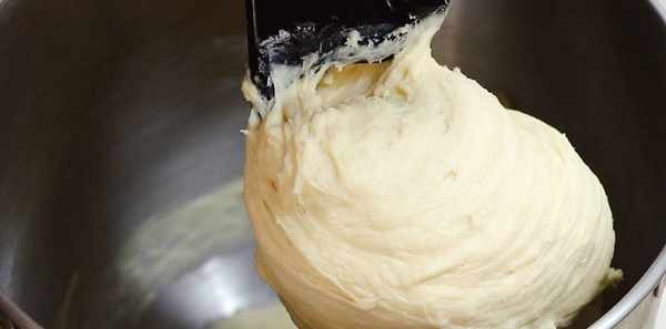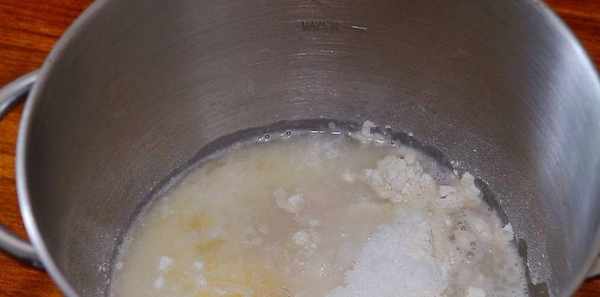 把酸奶餡兒準備好後,接下來準備麻花面團。先將500g面粉倒入揉面機中,加100g全蛋液,30g奶粉,230g清水,5g鹽,80g白糖,5g酵母,攪拌均勻。