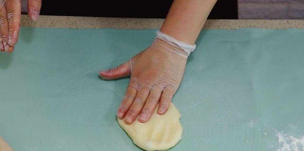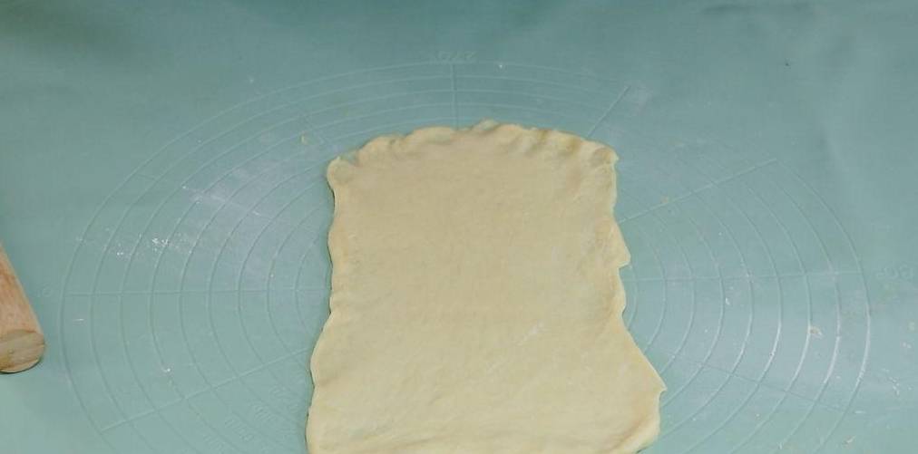 取一塊面劑子,用手按扁後,再用搟面杖搟成長方形的皮子。