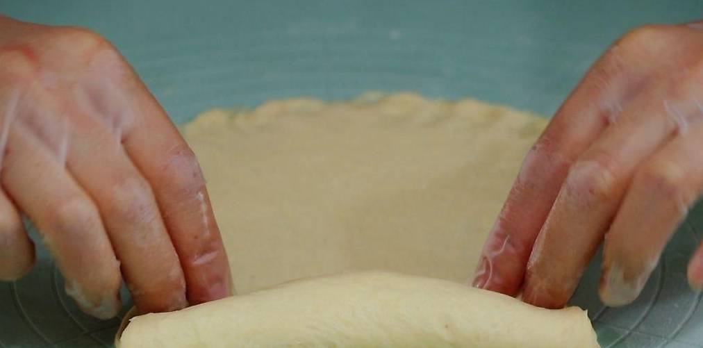 把搟好的皮子按壓扁平,在另外一端擠上酸奶餡兒,把酸奶餡兒用皮子卷起來,卷的時候一定不要讓酸奶餡兒露在外面。