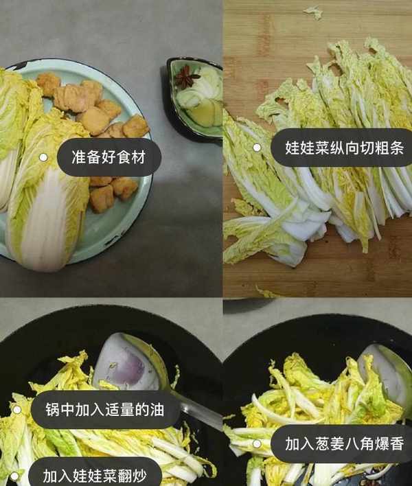 食材:娃娃菜、豆腐泡、蔥薑、八角等