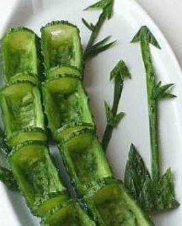 第3步,將做好的黃瓜段放入大盤子中擺好,然後再用剪刀將黃瓜皮剪出喜歡的造型,裝盤。