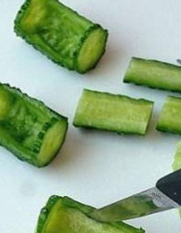 第2步,將黃瓜等分切段,表面劃出長方形的開口,然後用勺子或叉子將裡面的內芯取出來。將每一個都按照這樣的方式做好。