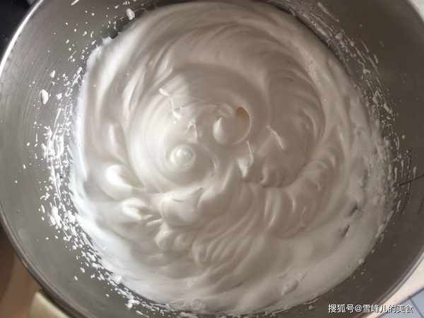 第二步:蛋清中加入檸檬汁去腥,再加入白糖,用電動打蛋器攪打成幹性發泡,提起打蛋器,打蛋器頭上呈倒三角就可以瞭。如果新手不會看,就插根筷子,筷子不倒就說明蛋清打好瞭。