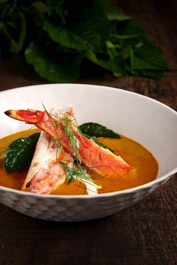 泰南風味咖哩帝王蟹 選用肉質飽滿鮮嫩的阿拉斯加帝王蟹,搭配自傢制香辣黃咖哩,潔白鮮嫩的蟹肉被咖哩的香味滿滿包裹,口味鮮香甜辣層次豐富,顏色鮮豔,讓人一吃就停不下來,讓嗜蟹者大呼過癮。