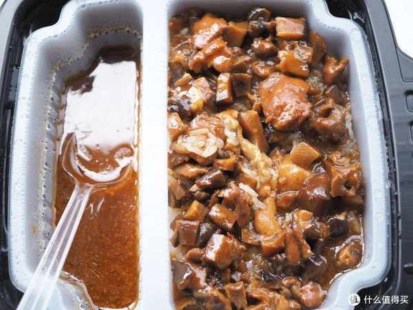 120克的米飯,180克料包,還附送一小包仲景香菇醬。鹵肉很地道,香菇與肉大約1:1,濃鬱的蔥香,味道鮮香甜美,醬汁非常下飯。不夠下飯也還有香菇醬幫忙。裡面還附送紙巾,甚至給瞭個塑料袋用於裝垃圾,貼心!除瞭價格,真沒啥缺點瞭!
