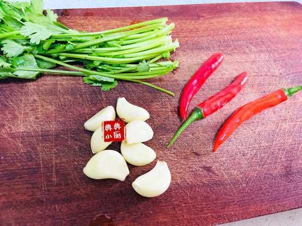 蒜剝好,紅尖椒切碎,再準備一些香菜,我還準備點辣椒粉,香蔥。