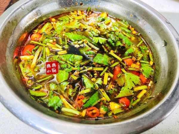 調一個醬籵。蒜,紅尖椒,辣椒粉,生抽,老抽,鹽,糖,蠔油,清水,香菜,淋上熱油拌均勻。