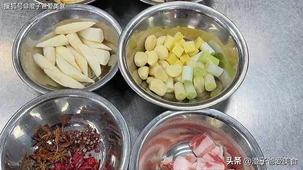 3.準備一下配料,山藥切成滾刀塊,春筍切成滾刀塊,五花肉切成片,適量的蔥薑蒜,花椒、八角、幹辣椒適量,