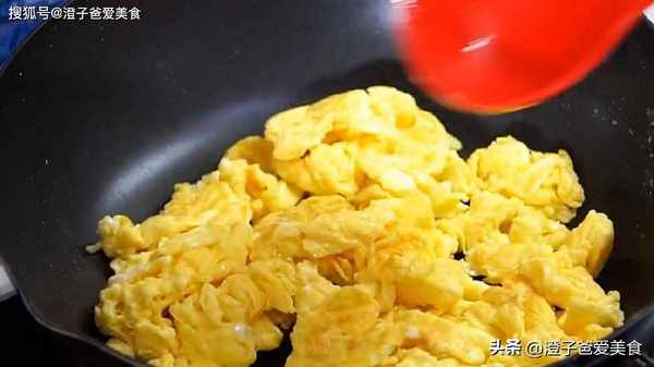 3.鍋裡加油,油熱以後下入蛋液,不要著急攪動,等到底部定型以後,輕輕的推動幾下,雞蛋完全定型以後,開大火翻炒半分鐘,把雞蛋炒老一點,更容易吸收西紅柿的湯汁,盛出來備用。