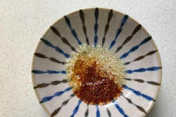 6.將蒜泥、五克白芝麻和五克辣椒面放入大碗中。