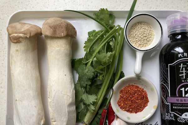 材料:杏鮑菇2個、香菜1根、小蔥1根、大蒜頭2瓣、小米椒2個、辣椒面5克、白芝麻5克、生抽1湯匙、鹽2克