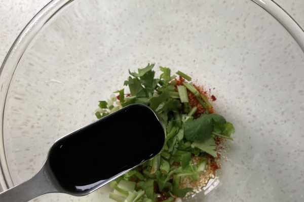 9.碗中放入香菜碎、小蔥和小米椒,加一湯匙生抽。