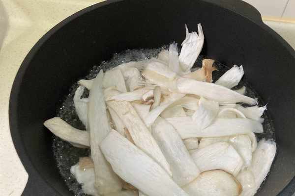 5.鍋中放入二碗水加二克鹽大火煮開,放入杏鮑菇焯水二分鐘並撈出瀝幹水分。
