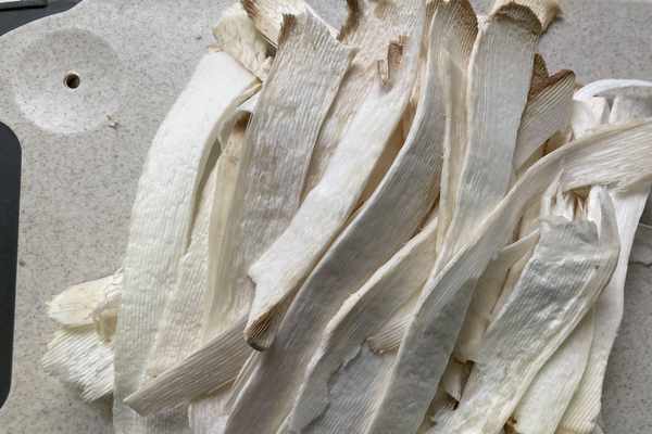 4.杏鮑菇洗凈用削皮器削成大薄片。