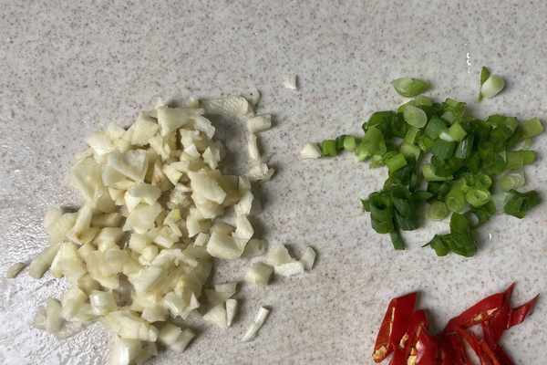 3.大蒜剁成蒜泥備用,小蔥切成小段備用,小米椒切成小段備用。