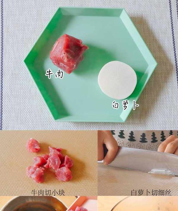 1.牛肉切小塊,白蘿卜去皮切細絲