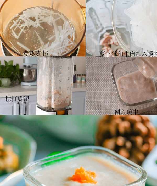 4.牛肉和白蘿卜倒入攪拌杯中,加40克溫水,攪打成泥