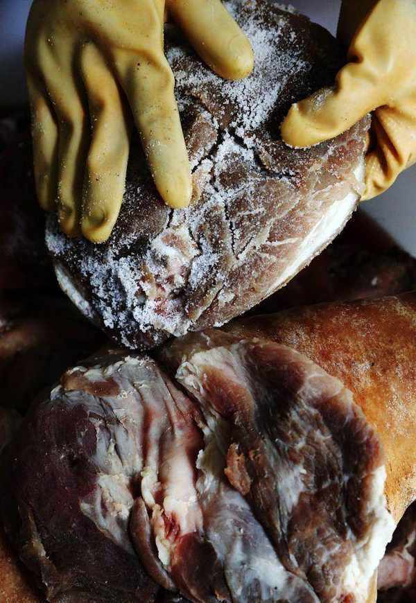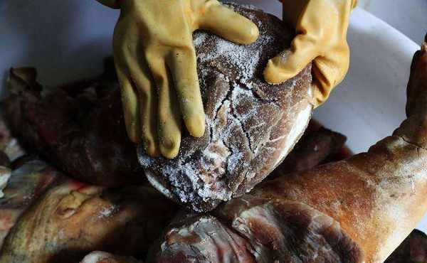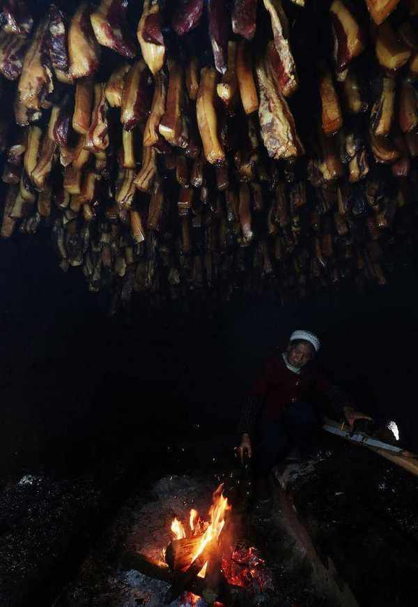 然後將年豬鮮肉用食鹽醃制,並用柴火和香樹枝進行熏烤,稱為“炕臘肉”。