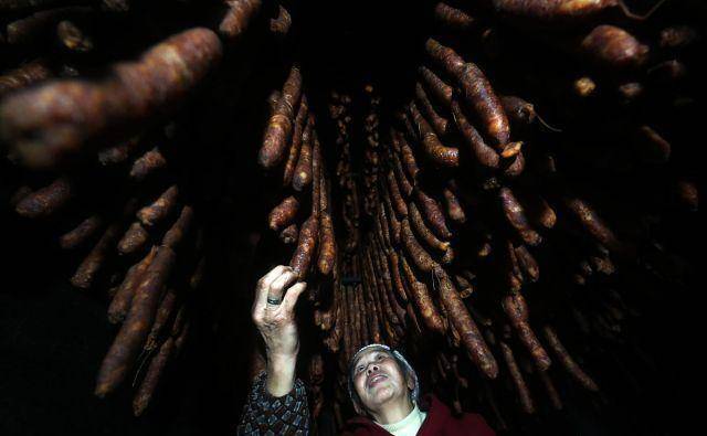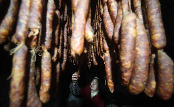 這是2019年1月23日,重慶市黔江區黎水鎮華陽社區,黔瑤農業開發股份公司員工肖玉梅在整理準備外銷的臘肉和臘香腸。