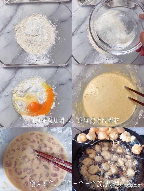 步驟四:面粉加淀粉,清水,雞蛋拌成面糊,把蝦仁倒入面糊之中,鍋裡放油,油熱後,把蝦仁一個一個的放入油鍋炸,榨汁表面酥脆,夾出。