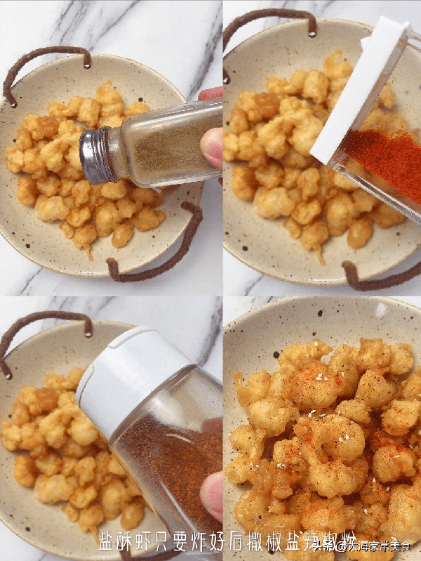 步驟六:剩下的蝦仁,撒上孜然,芝麻,椒鹽,辣椒粉就是香脆的“鹽酥蝦仁”瞭。