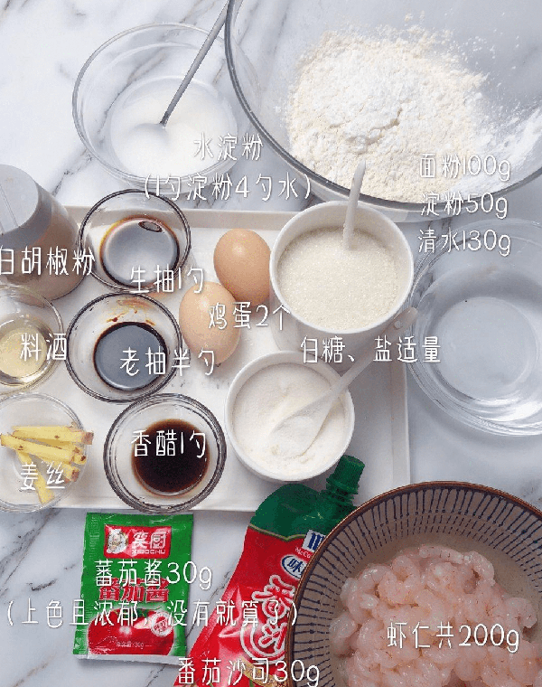 步驟一:準備食材:蝦仁300克,醃制蝦仁:料酒一勺,白胡椒粉,鹽適量,薑絲,面糊比例:面粉100克,淀粉0克,清水130克,雞蛋2個。