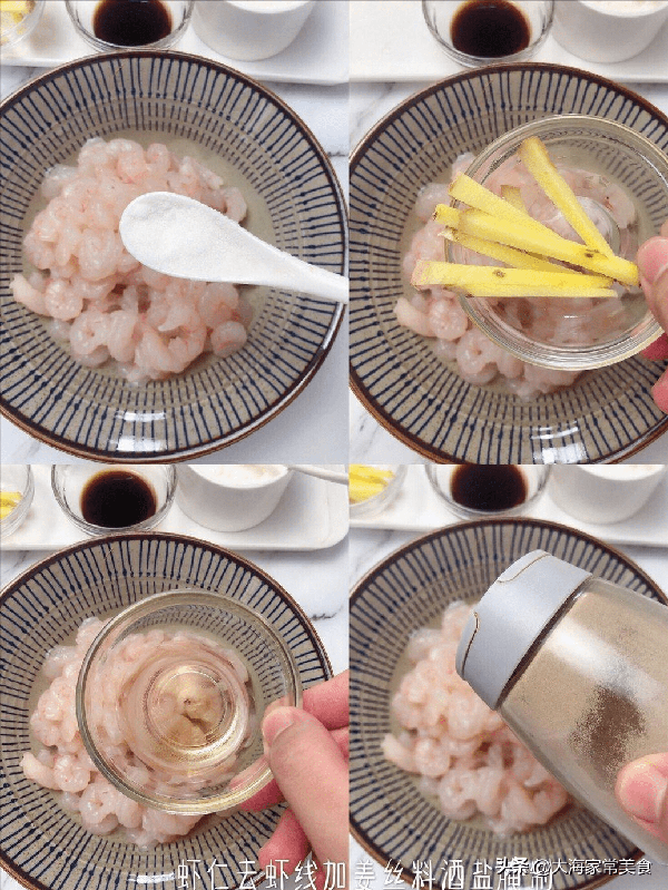 步驟三:買回來的蝦仁去蝦線,用料酒,薑絲,鹽醃制備用。