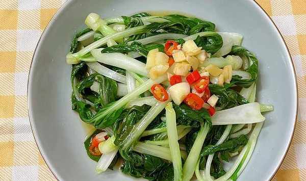 3、鍋中水倒掉,燒幹加油,燒熱,澆在小青菜上(重點是澆在蒜泥和青菜根部),刺啦刺啦的聲音,可以端上桌瞭~