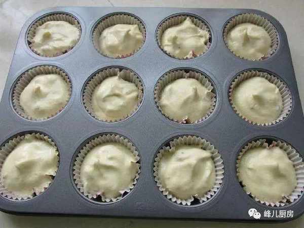 7、將蛋糕糊裝入紙杯,保持每個杯子八分滿。
