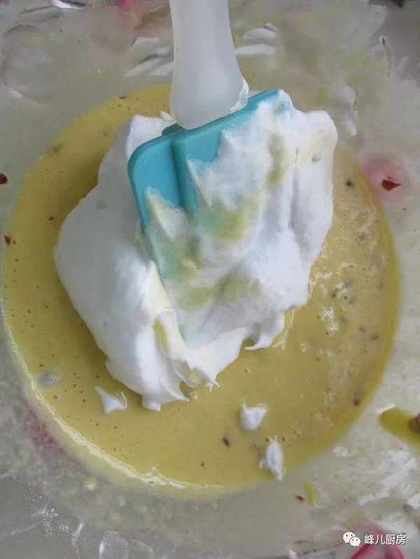 5、將上一步攪拌好的蛋糕糊全部倒入剩下三分之二的蛋白內,繼續上下快速翻拌並劃之字,使蛋黃蛋白攪拌均勻。