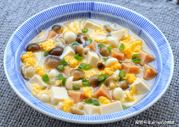 接著倒入豆腐、火腿丁,繼續煮五分鐘,再倒入少許淀粉水,不要太多。