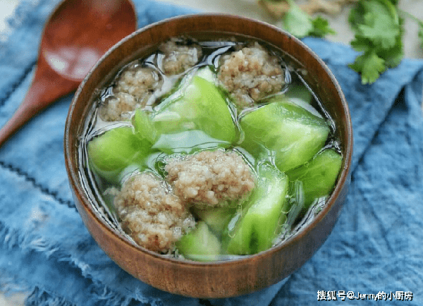 接著倒入絲瓜、鹽,繼續煮幾分鐘,煮到絲瓜和肉丸熟透。這道湯就做好瞭,不需要再加油,因為煮丸子的時候會滲出油。