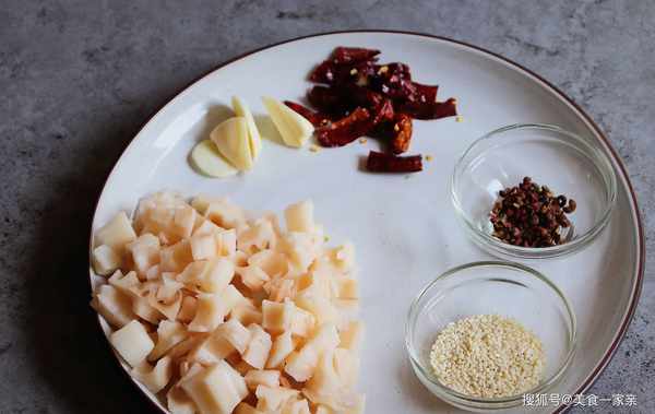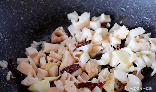 1、把蓮藕去皮後切丁,幹辣椒洗凈後切段,大蒜用刀背拍裂去皮切塊。