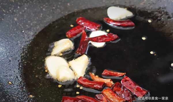 2、起鍋,在鍋裡倒入適量的油,小火燒熱,把大蒜、花椒、幹辣椒一起倒入爆香。