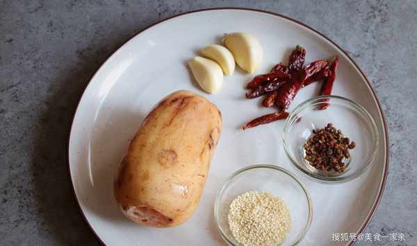 準備好食材:蓮藕1節、大蒜3粒、花椒2克、孜然3克、五香粉1克、幹辣椒6顆、白芝麻50克、食鹽1勺。