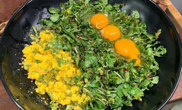 大盆中倒入玉米面,加入食鹽攪拌均勻,再倒入適量開水燙一下,攪勻,這樣吃著會更香,玉米面也更容易發黏成團。這裡要註意加入開水的量,看到玉米面成一個個球球狀就可以瞭,量多的話就會稀瞭,不太容易成型。然後倒入蒲公英,加入適量面粉,再打入3個雞蛋,用手抓拌均勻。