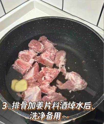 4:準備好一個湯鍋,鍋中放入一些排骨,丟入一些生薑片,還可以加上一些蔥結,倒入適量冷水,最後加上料酒少許,蓋上鍋蓋焯水一會兒,逼出裡面的血腥味,用溫水沖洗掉浮沫,這樣排骨湯燉出來不會腥。